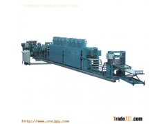 It is comprised of the dispersion mixer, the bucket lifter, the double conical-screw extruder sheeter, the coating calender, the air-cooled conveyor, the pulling slitter and the pulling cross-cutter, and usable for continuous operation of resin and asphalt slab coating.